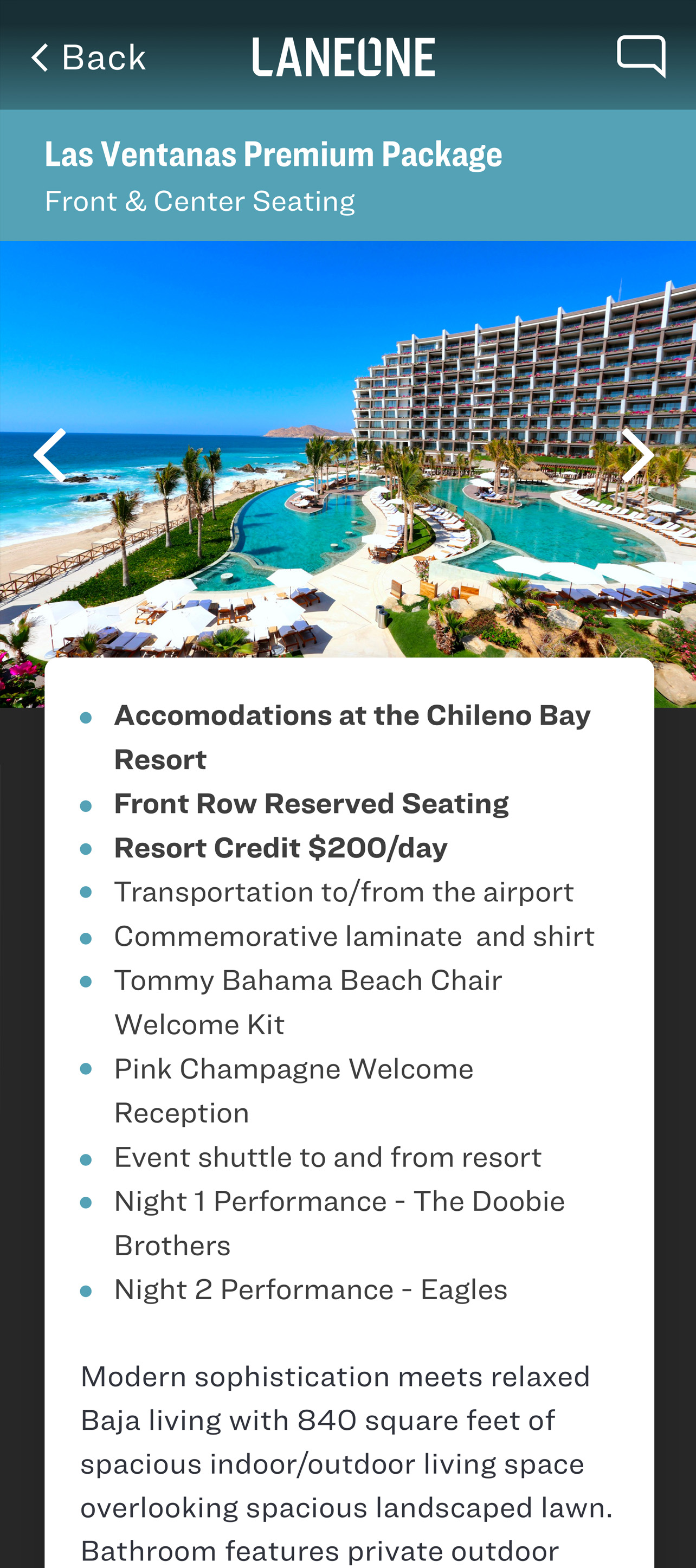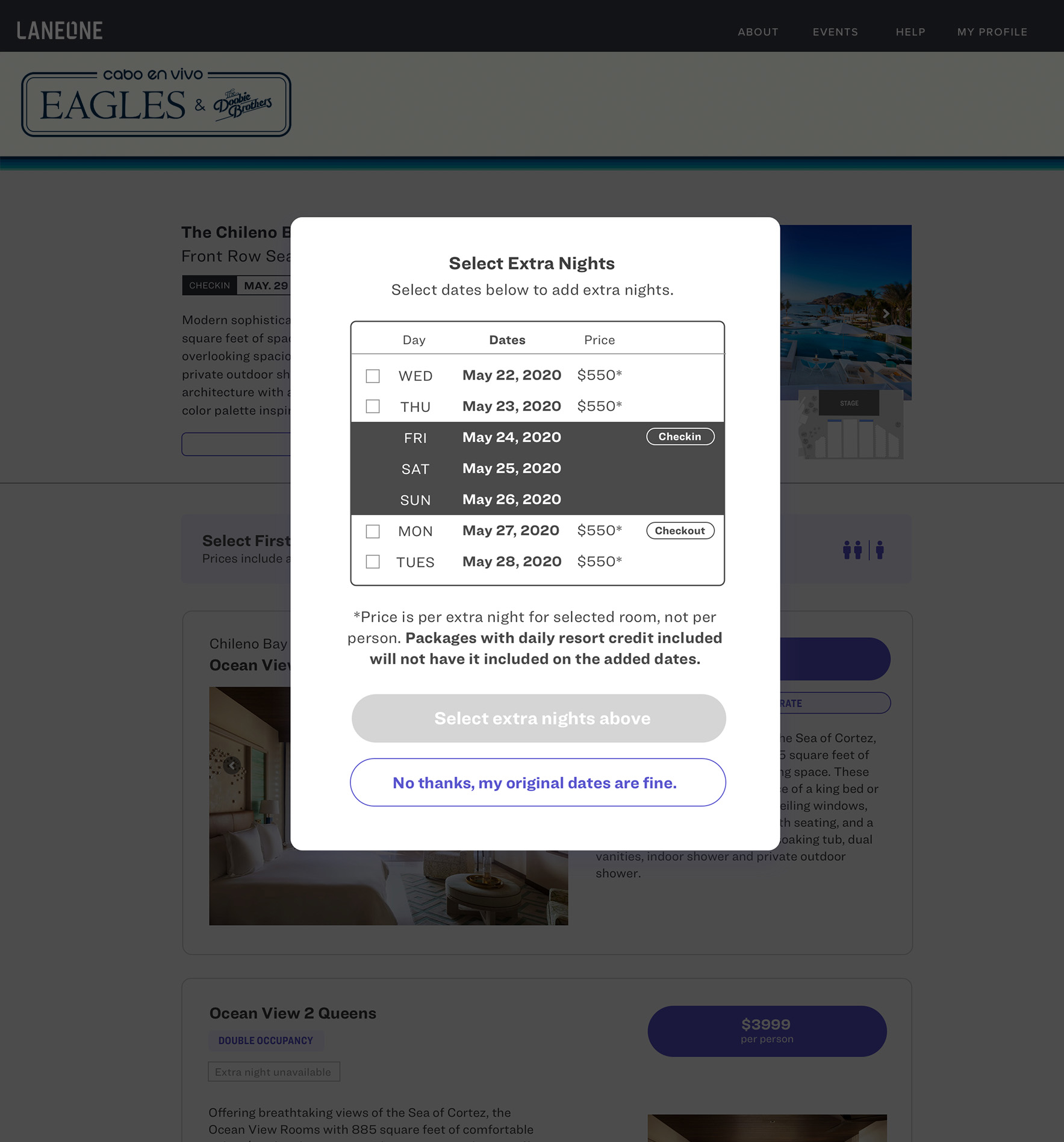 Once a user was funneled from the microsite to the LaneOne platform they were presented with a custom purchase flow to select lodging, seating, and any add-ons. The flow was designed to be as simple as possible while still accommodating a variety of options and price points.